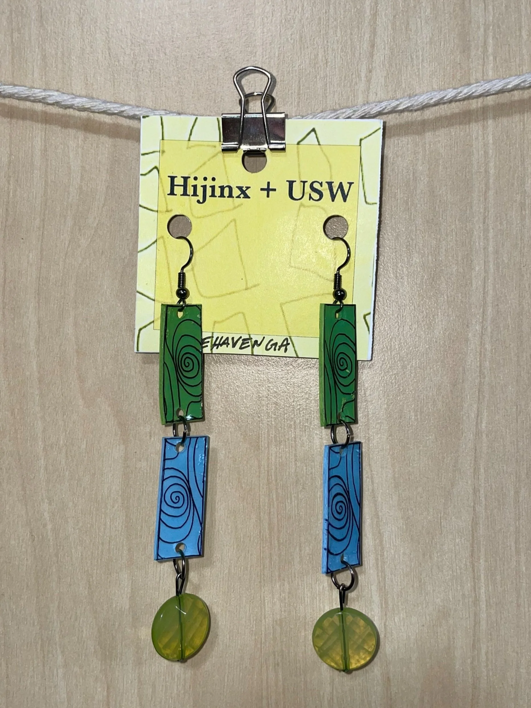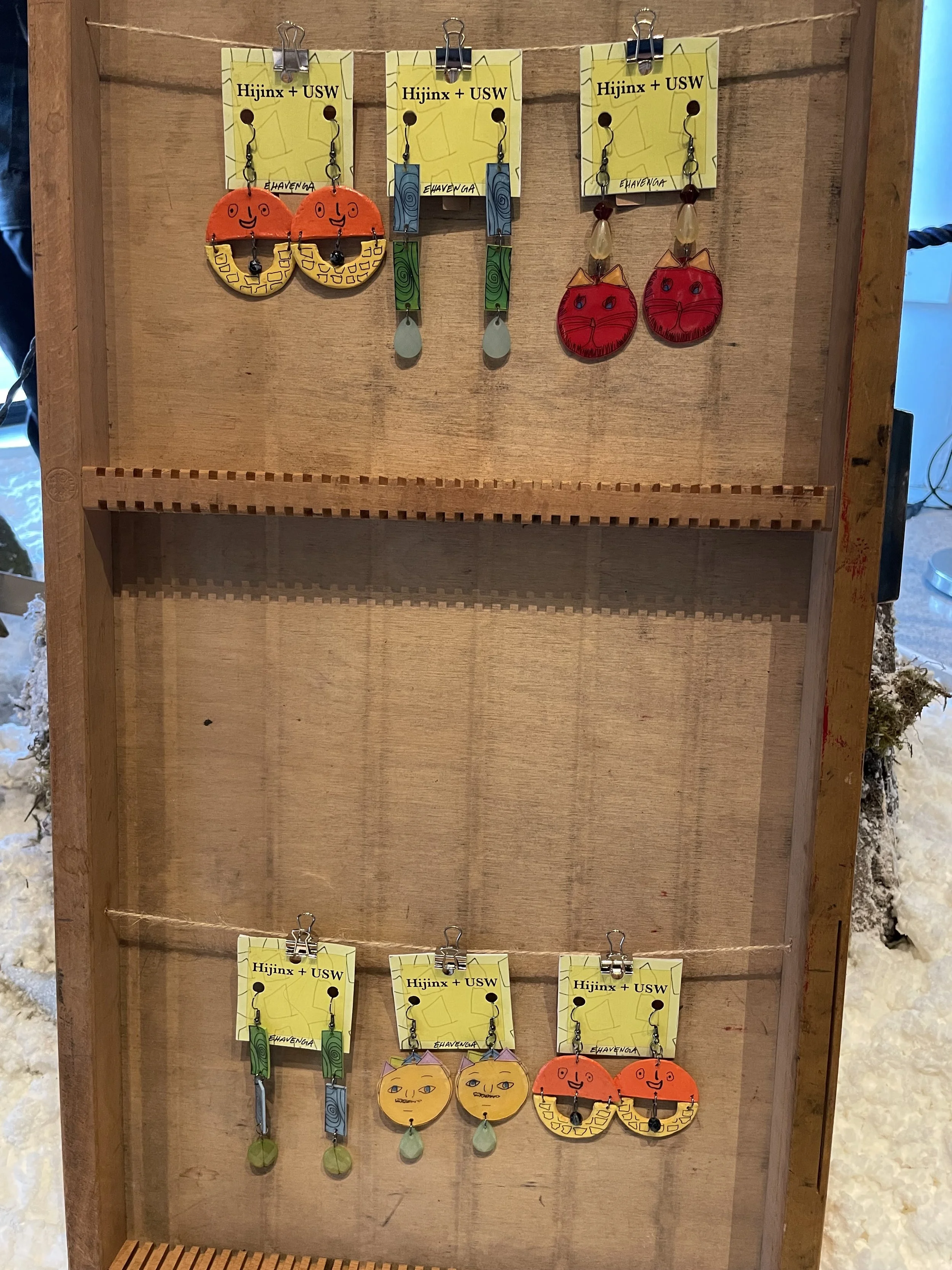 One of the aims of our workshop with Hijinx Odyssey members was for them to connect to the characters they were playing in their performance of Pinocchio and the Northern Lights. I spent most of our session interacting with Becky, who played the King and the cat Carlo, and Lewis, who played the Sea Captain. However, I found it necessary to represent the work of all our participants in my creations as they all expressed their excitement about working on and being in the show. I wanted to capture this excitement and connection in my work, so I created these earrings because they were an excellent way to recreate their exact drawings. The swirl, cat, and king earrings are made using paint markers and coloured pencils on shrink paper. I created the orange face earrings using clay, acrylic paint, and paint markers.
